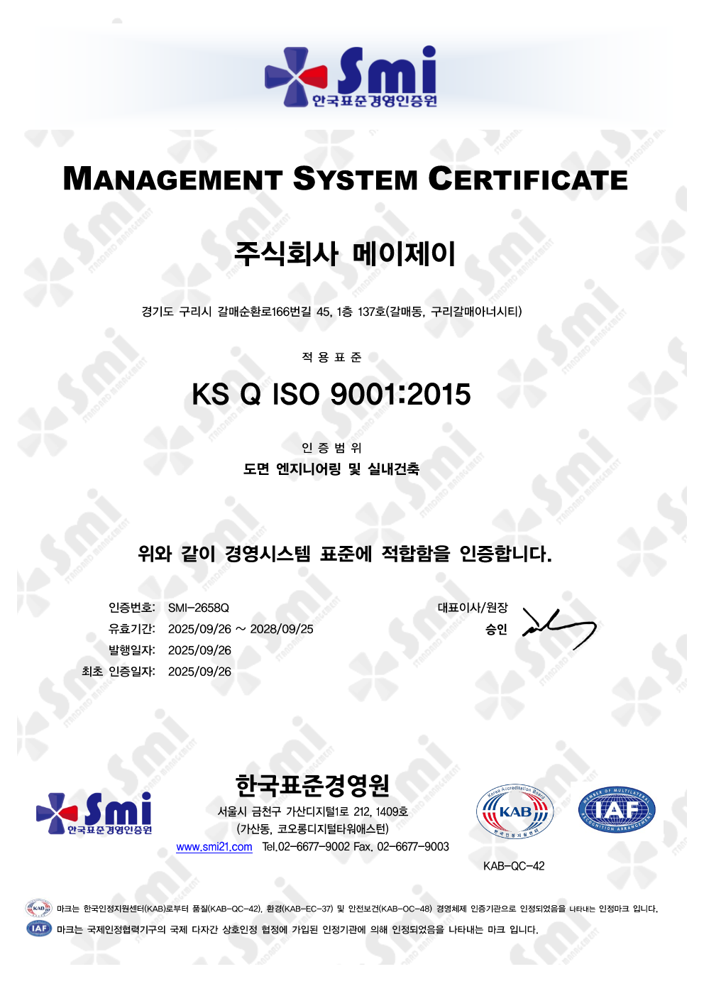 ISO 9001 : 품질경영시스템 작성자관리자 등록일 26-01-08 조회16회 본문 국제 표준 인증 ISO 9001 : 품질경영시스템 ISO 14001 : 환경경영시스템 본점 사업자등록증 목록